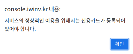 본인 인증을 진행하지 않고 관리 콘솔 또는 iwinv 웹페이지에서 서비스 생성/신청 버튼을 누르면 위와 같은 알림 메시지가 출력되며, 확인 버튼 클릭시 본인 인증 페이지로 이동합니다.